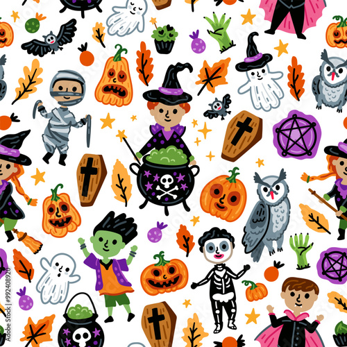 Seamless pattern of Halloween characters, Children in funny and scary witch, vampire and monster costumes background