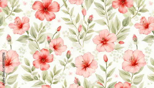 seamless pattern of hibiscus and parrots painted in watercolor, and an abstract botanical pattern of hibiscus painted in watercolor