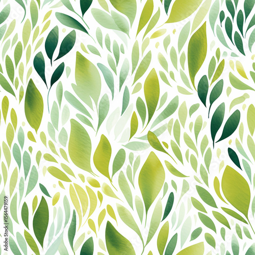 Seamless pattern of intricate design of various shades of green leaves, on white background. Leaves artistic blend of shapes and sizes, showcasing the beauty of nature through watercolor techniques