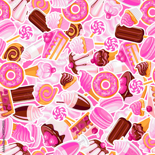 seamless pattern of pink and chocolate sweet food stickers. Cartoon donuts, ice cream, muffins, smoothies, macaroons and candies.Texture for fabric, wrapping, wallpaper. Decorative print.