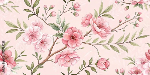 Seamless pattern of pink cherry blossoms and green leaves on a light pink background Keywords: cherry, blossoms, pink, flowers, pattern, seamless, floral, botanical, leaves, green, branches