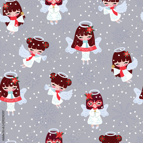 Seamless pattern of pretty Christmas angels in the snow. Cute background for winter holiday. Vector Illustration.
