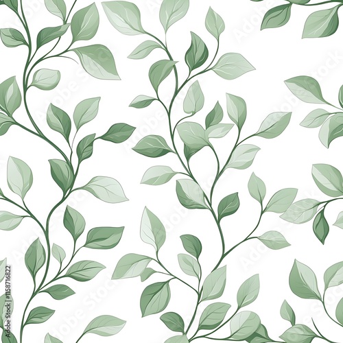 Seamless pattern of sage green vines gracefully sprawled across a crisp white background