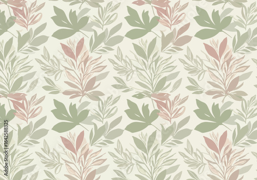 leaf, leaf, pattern, seamless, repeat, foliage, botanical, floral, design, texture, background, surface, print, textile, wallpaper, nature, organic, plant, stylised, illustration, drawing, green, pink, beige, pastel, soft, light, elegant, decorative, modern, contemporary, artistic, abstract, vector, graphic, element, motif, tile, swatch, template, scrapbooking, paper, fabric, fashion, decor, home, interior, spring