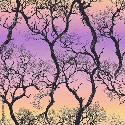 seamless pattern of tree silhouettes with intricate branches against a gradient sky