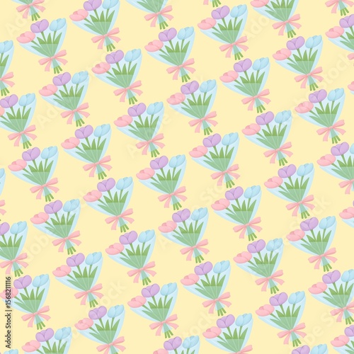“Seamless pattern of tulip bouquet in soft pastel tones, perfect for wrapping paper and notebook covers.”