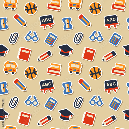 pattern, seamless, school, education, beige, background, student, wallpaper, fabric, textile, wrapping paper, learning, childhood, fun, back to school, academic year, supply, tool, stationery, basketball, calculating machine, crayons, ruler, paper clip, school bus, sharpener, notebook, play, eraser, magnifier, thumbtack, cartoon, flat, illustration, vector, endless, tileable, graphic, design, icon, creative, colourful, playful, sticker, symbol