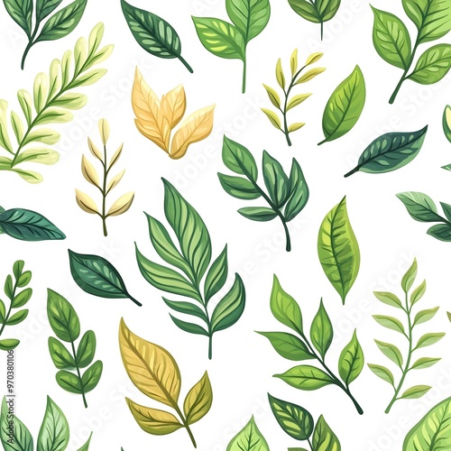 Seamless Pattern of Vibrant Green and Yellow Leaves on White Background