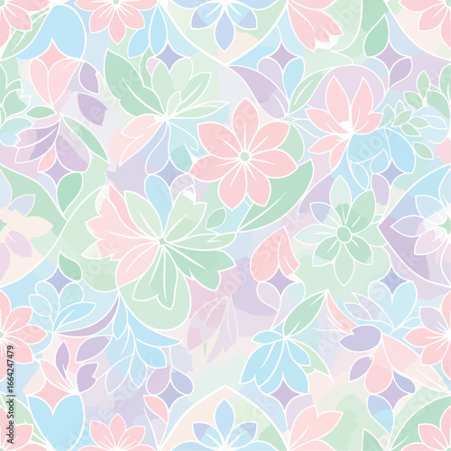 Seamless Pattern, Pastel floral pattern with delicate outlines and soft watercolor texture evokes serenity Stock royalty free image.
