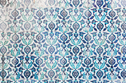 Seamless pattern white Turkish tiles with blue ornaments. Old su