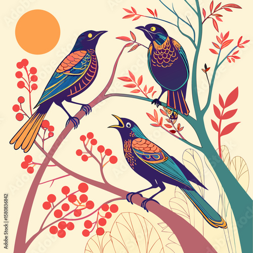 bird, tree, animal, tree branch, vector, illustration, cartoon, nature, bird, cute, love, spring, design, flower, leaf, beak, feather, pattern, drawing, art, animal, card, sparrow, decoration, parrot