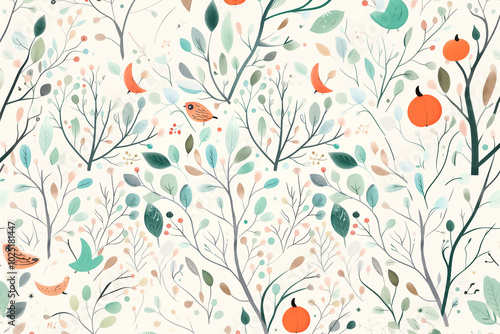 seamless pattern with birds and autumn trees in pale green and orange pastel hues