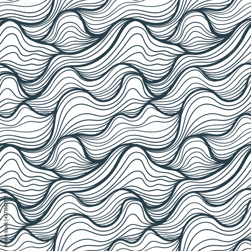 Seamless pattern with black linear waves. Design for backdrops and colouring book with sea, rivers or water texture. Repeating texture. Figure for textiles. Print for the cover of the book, postcards.