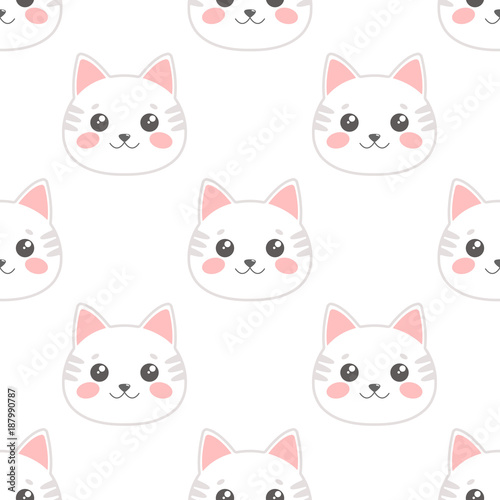 Seamless Pattern with Cartoon Cat's Heads on White Background. Vector illustration