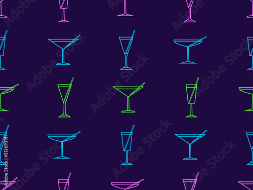 Seamless pattern with cocktail icon in line art style. Alcoholic cocktails with a straw. Multi-colored cocktails design for printing, banners and promotional items. Vector illustration