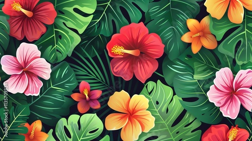 Seamless pattern with colorful hibiscus flowers and green tropical leaves.