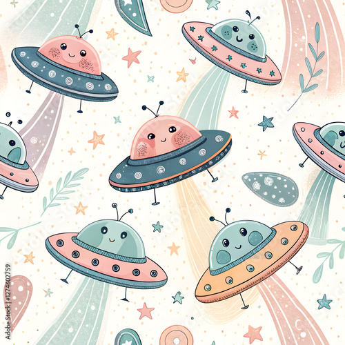 seamless pattern with cute cartoon ufo aliens on white
