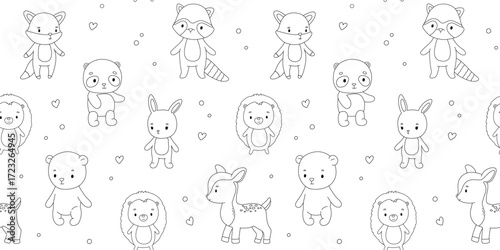 seamless, cute, outline, pattern, animal, panda, timberland, baby, background, raccoon, isolated, art, hand, illustration, cartoon, white, children, children, graphic, drawing, funny, bear, set, rabbit, cervid, fox, rabbit, shower, hedgehog, childcare center, drawn, little, line, book, page, vector, monochrome, icon, contour, endless, repeat, textile, fabric, wallpaper, bg, tile, repeating