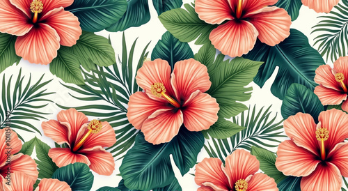 flower, pattern, floral, seamless, vector, nature, leaf, spring, summer, design, illustration, art, decoration, wallpaper, hibiscus, pink, beauty, vintage, plant, blossom, flora, texture, ornament, garden