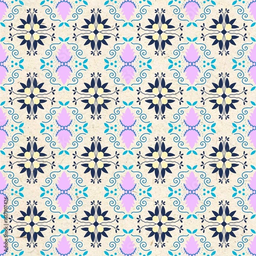 seamless pattern, mediterranean, ornamental, decorative, intricate, ornate, vintage, traditional, folk art, spanish, portuguese, moroccan, italian, arabian, abstract, symmetric, tileable, textile design, wallpaper, scrapbook, stationery, navy blue, light blue, lavandula, cream, textured, distressed, aged, background, illustration, vector, elegant, classic, charming, cultural, artistic, graphic design, heritage, pattern