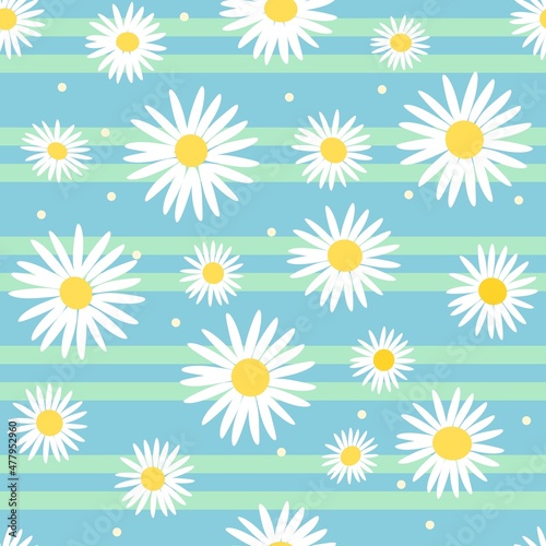 Seamless pattern with flowers, white daisy drawing, vector illustration, blue background