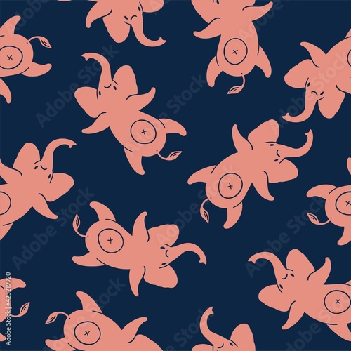 Seamless pattern with funny pink elephants on a dark blue background. Vector pattern for fabrics, clothes, for wrappers and packages, wallpaper, pastelgo linen and textiles, baby products