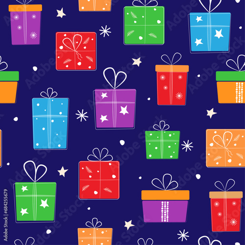 Seamless pattern with gift boxes with bows. Festive print for packaging and textiles. Vector graphics.