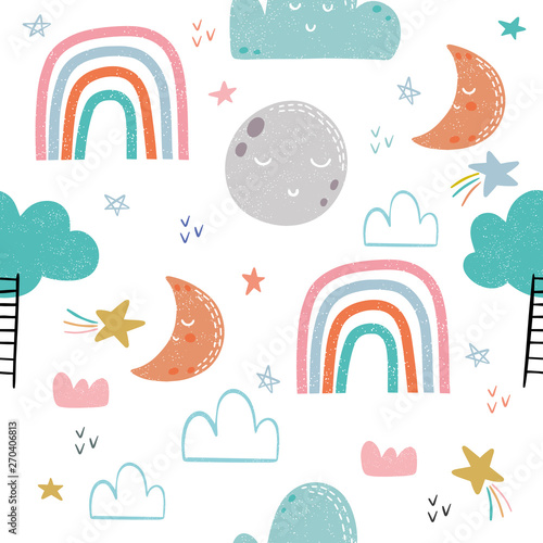 Seamless pattern with hand drawn rainbow, moon and clouds. Childish texture for fabric, textile, apparel. Vector background