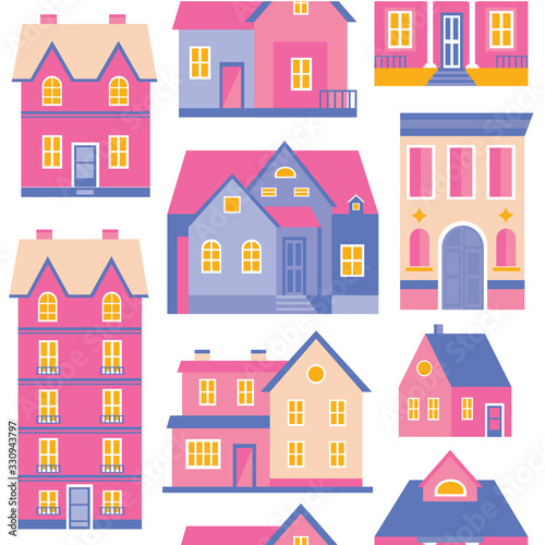 illustration, pattern, seamless, vector, hand, drawn, pink, background, house, city, town, home, design, cute, cosy, tree, architecture, paper, light, nature, holiday, winter, texture, season, spring, village, wallpaper, apartment, landscape, cartoon, childish, gentle, children, urban, children, old, sweet, european, stroke, window, icon, collection, street, fun, style, bungalow