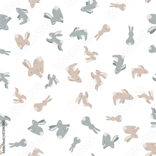 Seamless pattern with rabbits. Hare, Easter, spring, flowers. Childish cute print. Vector graphics.