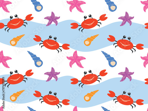 Seamless pattern with sea creatures. Vector illustration of crab and seashells on the waves for print, textile, wallpaper, wrapping paper, eps 10. Spotty sea background, surface textures. Marine life