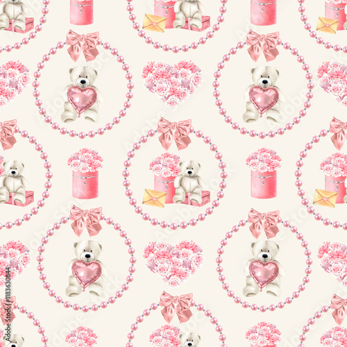 Seamless pattern with Teddy bear, gift boxes, roses, pearl wreath. Watercolor illustration of Valentine's background for wrapping paper, textile design on light backdrop. Drawing of textile ornament.