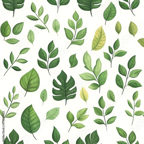 Seamless pattern with vibrant and fresh natural leaves on clean white background