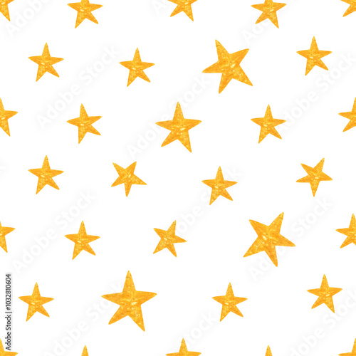 Seamless pattern with yellow stars, watercolor illustration. Stars on a white background. Cosmic, astronomical pattern, magical ornament. Good for fabric, textile, pajama, linen, wallpaper, background