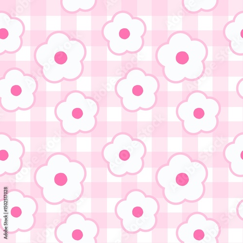Seamless pink gingham pattern with simple white flowers and pink centers. Cute and soft design perfect for baby products, fabric, wallpapers, and feminine-themed projects.
