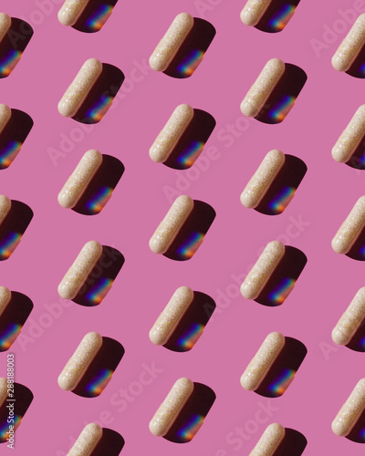Seamless, repetitive pattern of white glittery pills with rainbow on a pink background