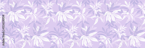 Seamless tropical leaf pattern with hand drawn style foliage in soft violet and lavender on a pastel purple background. Perfect for textiles, wallpapers, packaging, surface design