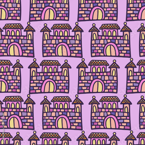 Seamless vector colorful illustration pattern design of silhouette of medieval cartoon castle