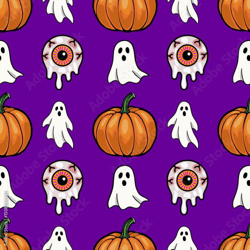 Seamless vector Halloween pattern featuring quirky pumpkins, spooky ghosts, and melting eyeball illustrations on a vibrant purple background, perfect for festive designs.