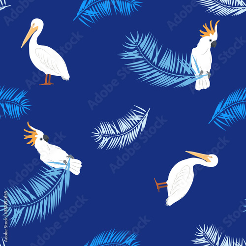 Seamless vector illustration with pelicans, parrots and palm leaves
