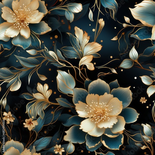 Seamless Vector Image of a Dark Floral Pattern with Golden Details