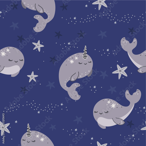 Seamless vector pattern. Cute whales and narwhals, starfish, bubbles. Gentle and cute pattern