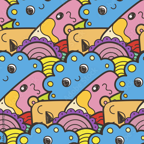 Seamless vector pattern with cute cartoon monsters and beasts. Nice for packaging, wrapping paper, coloring pages, wallpaper, fabric, fashion, home decor, prints etc
