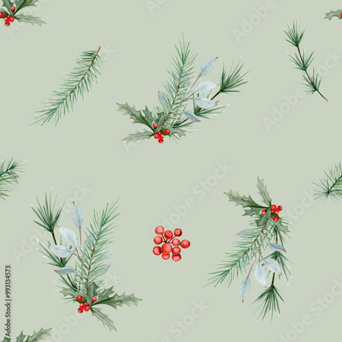 seamless watercolor pattern with a bouquet of spruce and pine branches, holly tree and red berries on a light green background