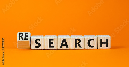 Search or research symbol. Turned wooden cubes and changed the concept word search to research. Beautiful orange table orange background, copy space.Business and search or research concept.