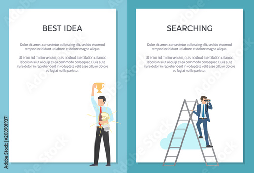 best, idea, search, work, business, success, inspiration, solution, corporate, leadership, person, leader, company, businessman, men at work, succeed, light, bulb, conceptual, metaphor, thinks, creativity, successful, professional, occupation, winner, achievement, imagination, motivation, inspirational, management, winning, cup, trophy, ladder, racked, binocular, opportunity, career, entrepreneur, faceless, graphic, set, poster, text, cartoon, style, isolated, vector, illustration