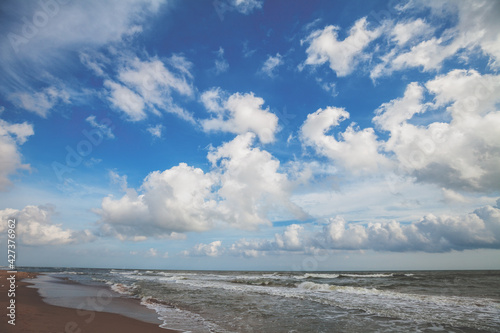 Seascape on a sunny day. Stormy sea with a beautiful cloudy sky. Nature landscape