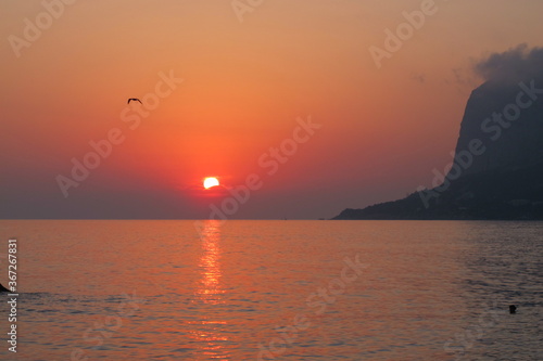 Seascape sunset on the sea, cloud on the top of the mountain, the sun sets in the clouds on the horizon, the sea and sky are orange-pink