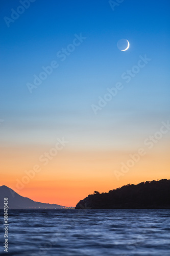 copy space, yellow, water, twilight, town, sunset, seascape, sea, orange, night, mountain, moon, light, crescent, blue