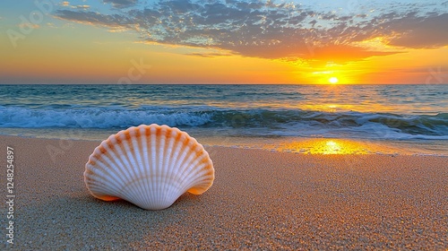 Seashell on Sandy Beach at Sunset: A Serene Seascape Photo